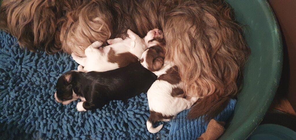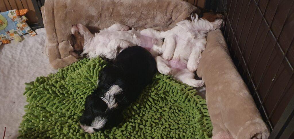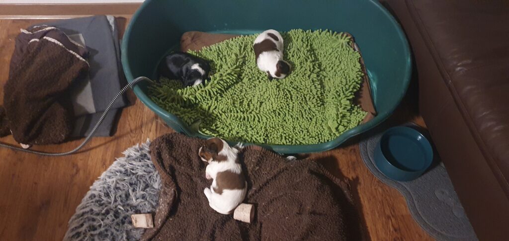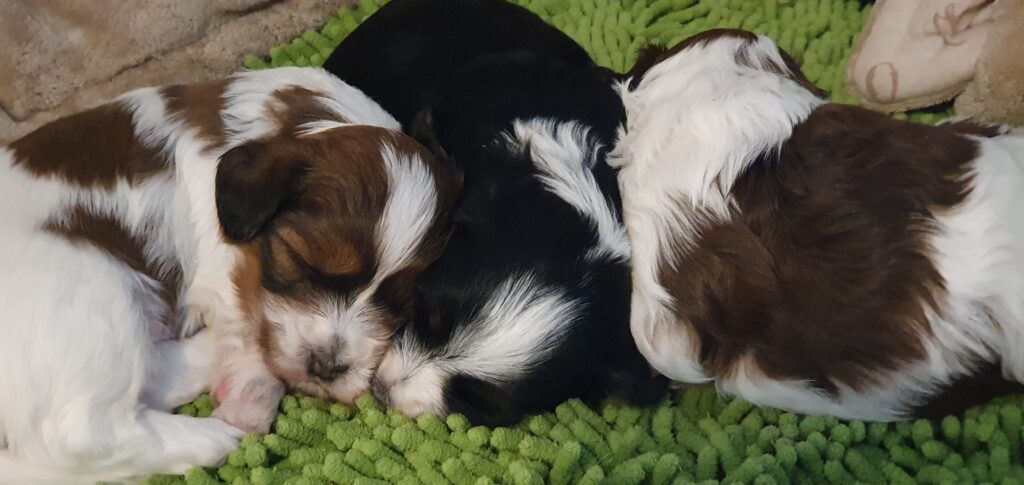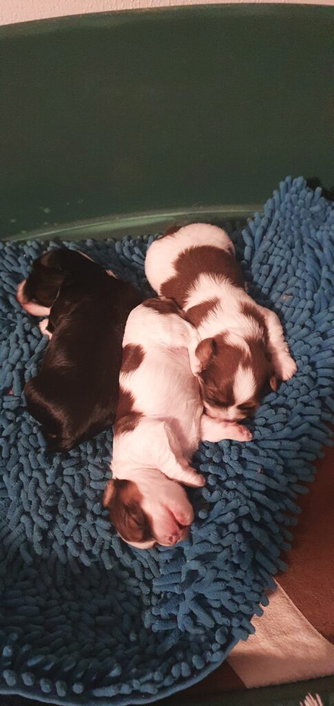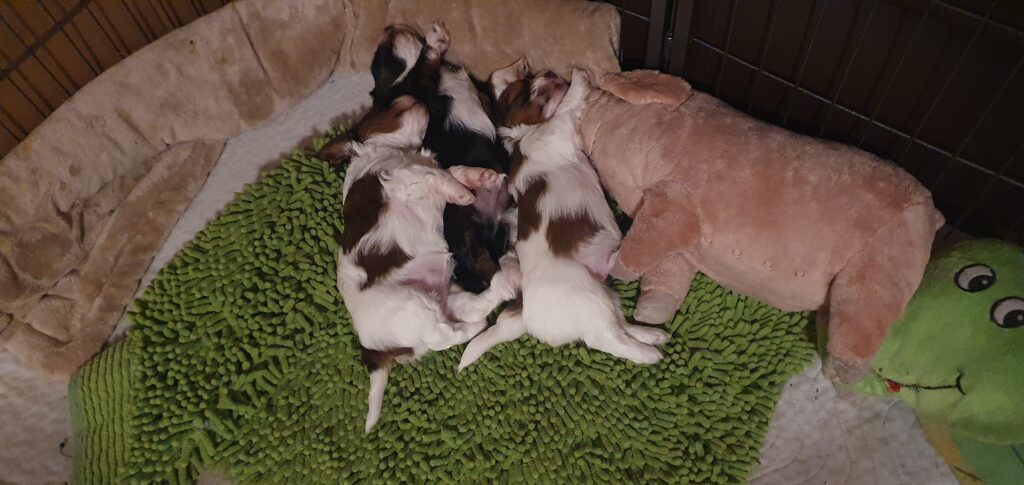 Nun schon 3einhalb Wochen alt ist schlafen nach wie vor die wichtigste Tätigkeit. Die Aufnahme fester Nahrung ist noch immer sehr minimal. Pina gibt unglaublich viel Milch. Gut für die Welpen, nicht so gut für die Mama. Alle 3 wiegen jetzt mehr als ein kg. Die erste Wurmkur ist gut verdaut. Lustige Beißspiele stehen regelmäßig auf der Tagesordnung. Ihre Schlafpositionen zeigen mir, es geht ihnen ausgezeichnet.